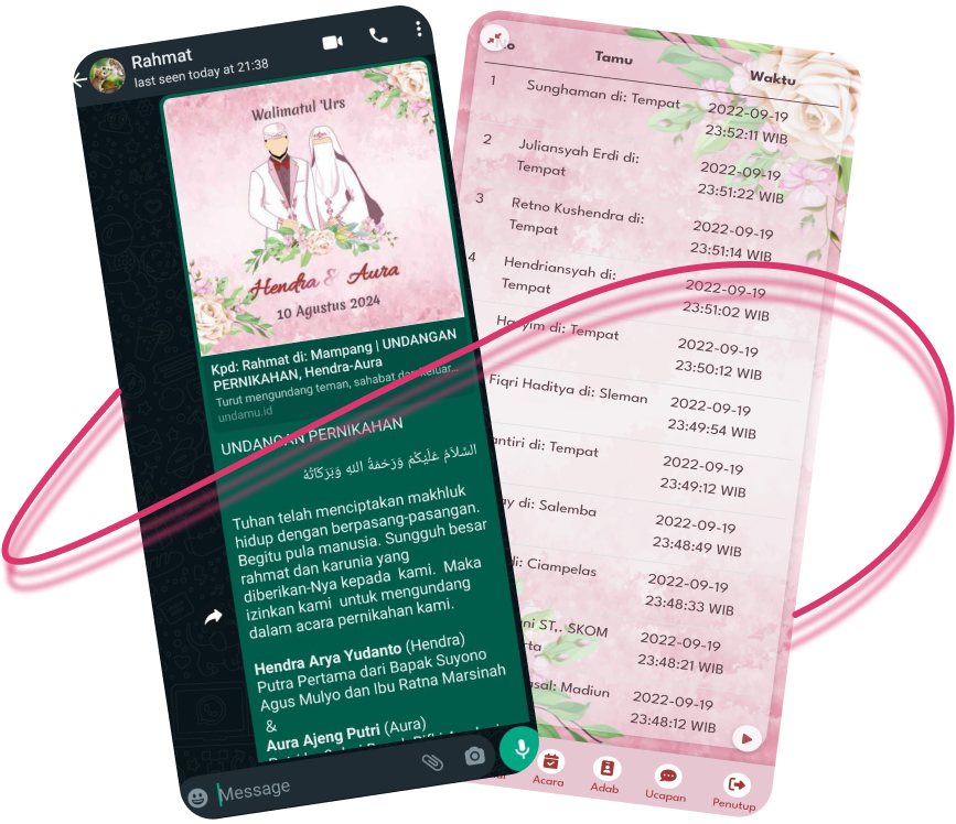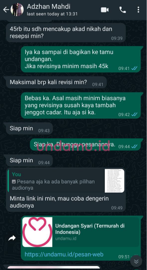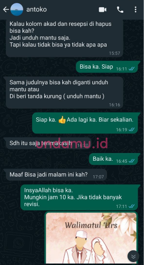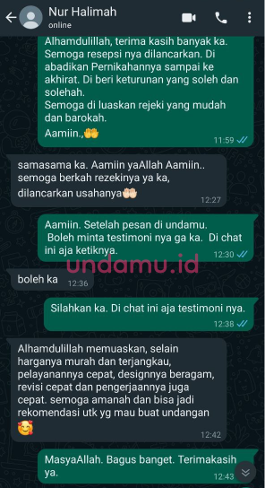 Undamu memudahkan kamu untuk membuat undangan syar'i. Hanya dengan genggaman, kamu bisa pesan undangan yang kamu inginkan. Kamu bisa lihat video berikut sebagai cara untuk pesan undangan. Silahkan hubungi admin jika masih ada yang ingin kamu tanyakan. Tanya Admin