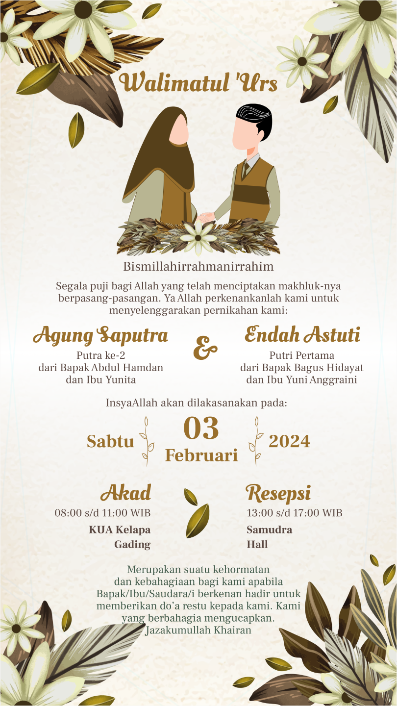 Simpan dan bagikan poster digital pernikahan kami sebagai bentuk dukungan dan kenangan indah. Terima kasih telah menjadi bagian dari hari istimewa kami.