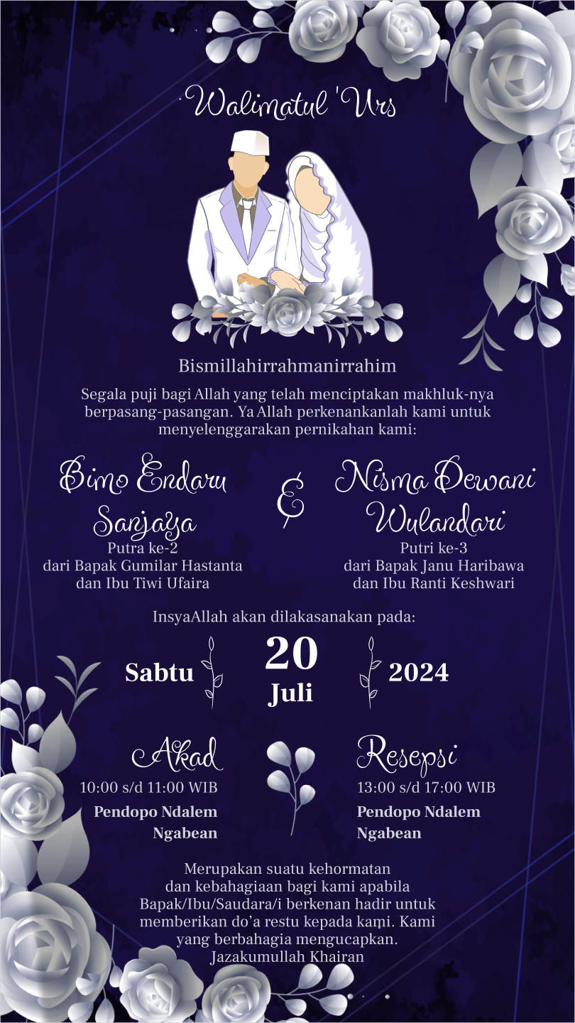 Simpan dan bagikan poster digital pernikahan kami sebagai bentuk dukungan dan kenangan indah. Terima kasih telah menjadi bagian dari hari istimewa kami.