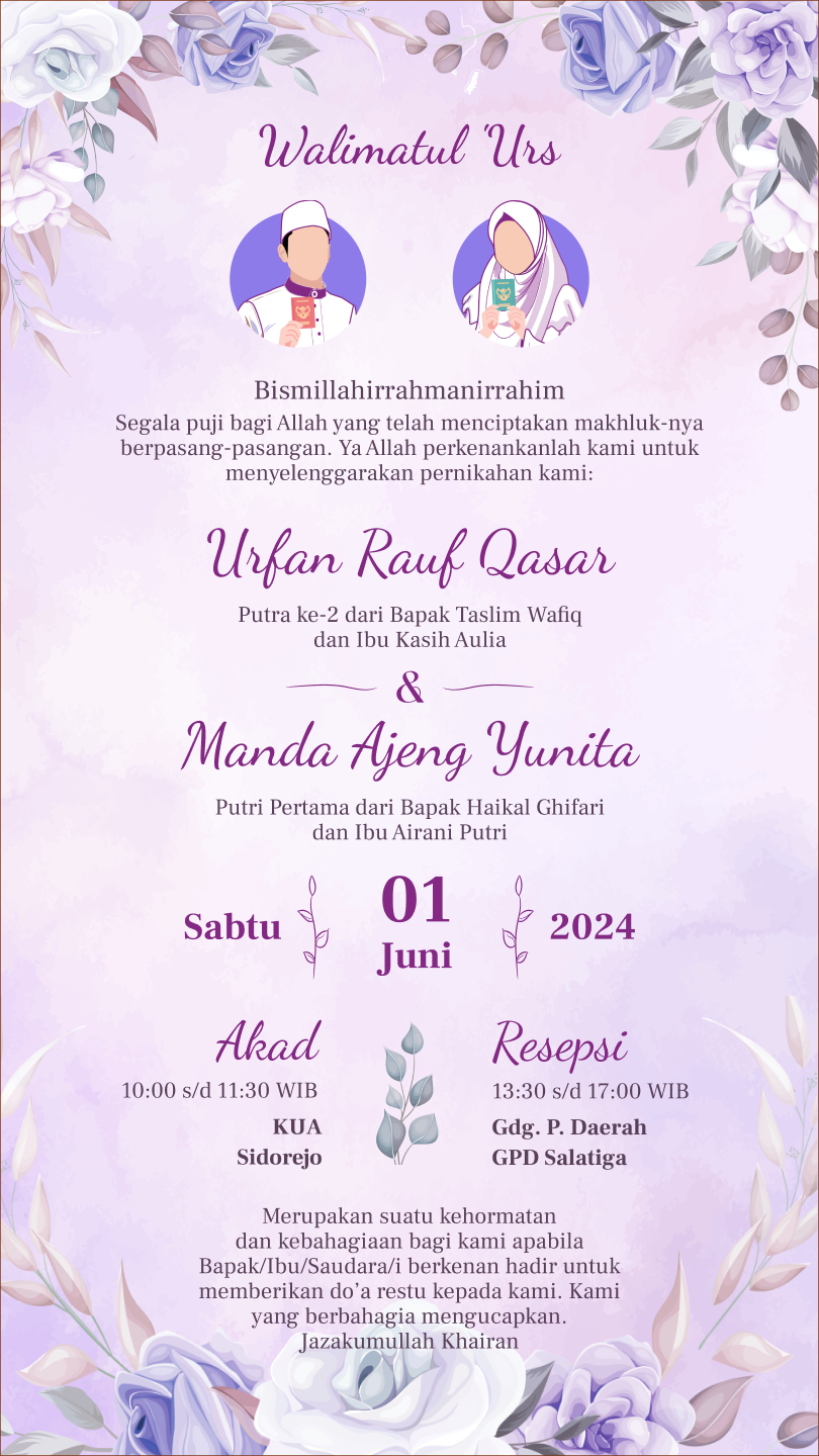 Simpan dan bagikan poster digital pernikahan kami sebagai bentuk dukungan dan kenangan indah. Terima kasih telah menjadi bagian dari hari istimewa kami.